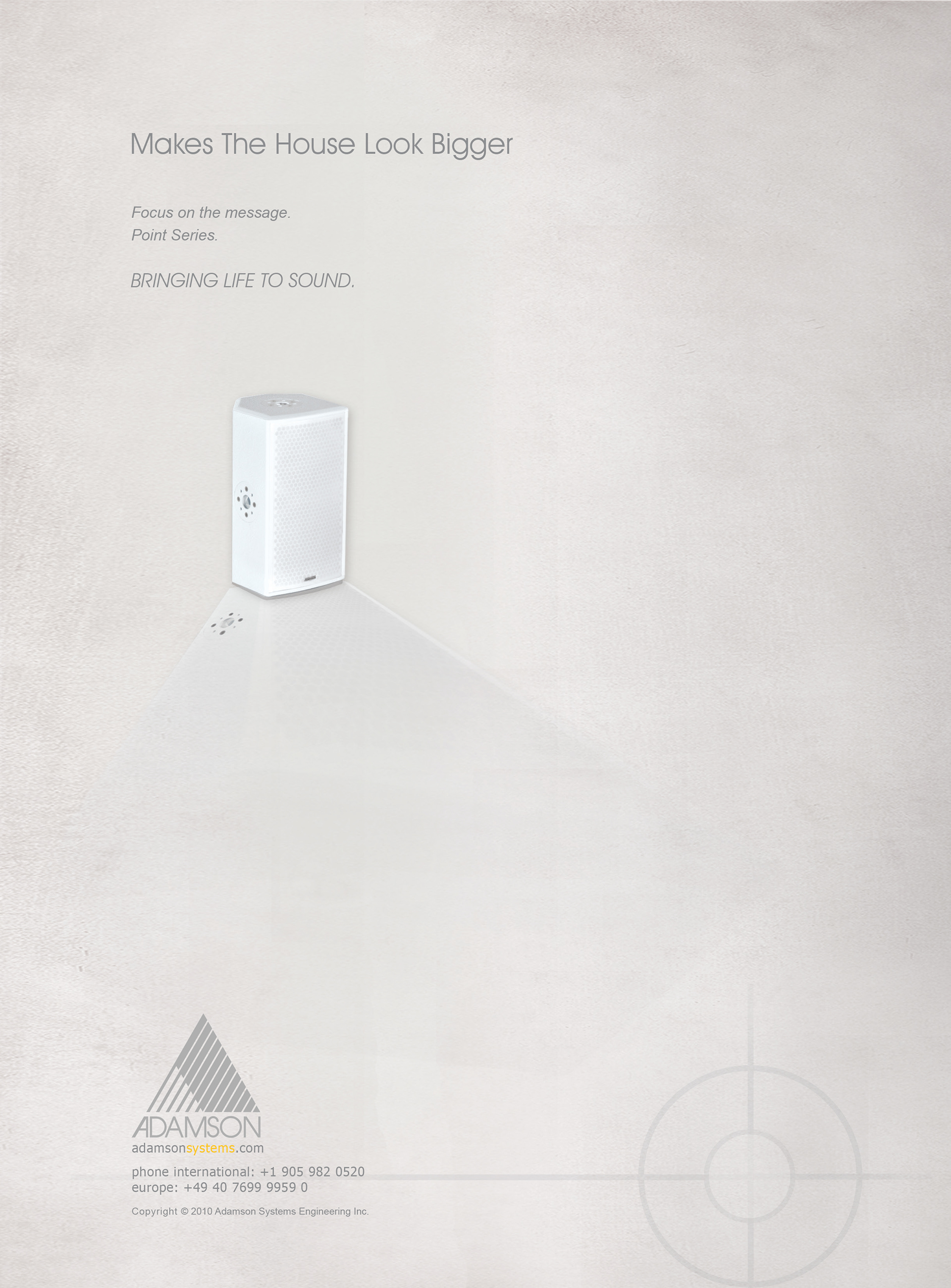 This is the second Point Series ad. The series offers compact, custom-colour loudspeakers, which make for a discreet installation in any venue and provide sound much larger than expected from a compact enclosure (Hence the oversized shadow - marking the sound "coverage" pattern of the loudspeaker box). 'House' is often the word used for a religious venue. This ad was commonly used in publications aimed at the Houses of Worship market segment. Created using Adobe Photoshop and Indesign.