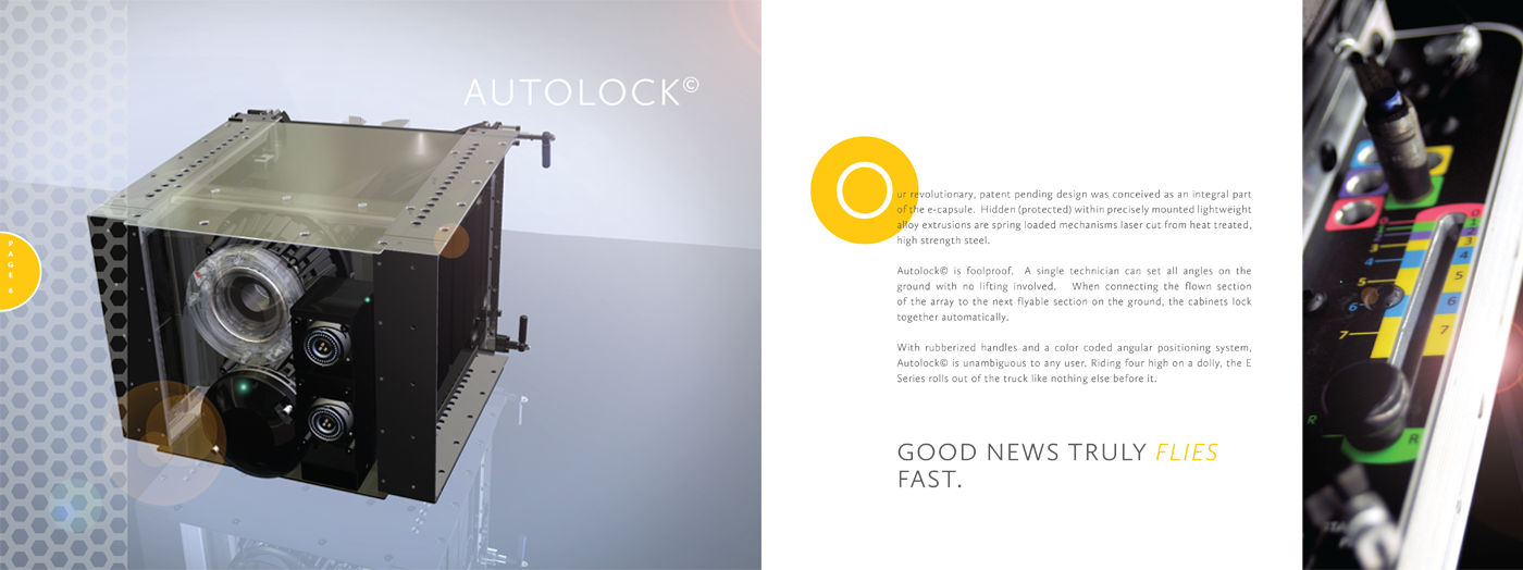 This brochure was created using a lot of images captured from Autocad Inventor, which were then touched up in Photoshop. The final size was 10" x 7", printed on silk-finished card stock with spot UV on all logos and tag lines in the covers. It was finished with a yellow thread-bound spine. The body copy throughout was a collaboration. Creative direction, photography, and all graphic design. This brochure was created using a lot of images captured from Autocad Inventor, which were then touched up in Photoshop. The final size was 10" x 7", printed on silk-finished card stock with spot UV on all logos and tag lines in the covers. It was finished with a yellow thread-bound spine. The body copy throughout was a collaboration. Creative direction, photography, and all graphic design.